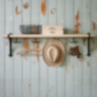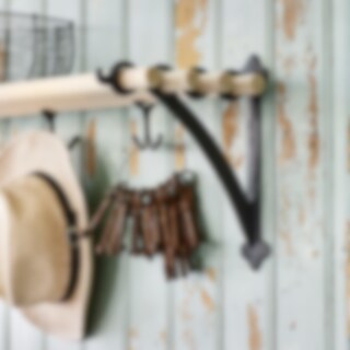 Anchor hook for extra hanging for the Evert shelf from Strömshaga. The hook is made of black metal and is threaded on the round wooden bar on the shelf.