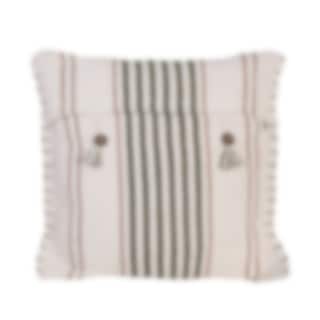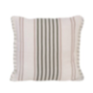 Cushion cover with a light base and green striped pattern. The design is reversible, with two decorative buttons and fringes on one side for added detail. Made from a sturdy blend of jute, cotton, and polyester.