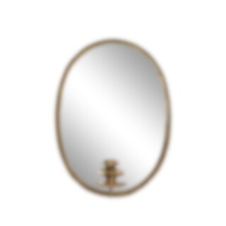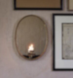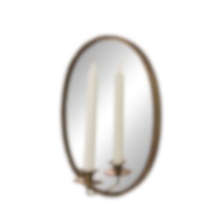 Oval mirror with an antique brass finish featuring a decorative edge accented by small round dots. Equipped with a brass candle holder designed for taper candles. The mirror reflects the candle flame, creating an elegant light effect.