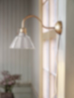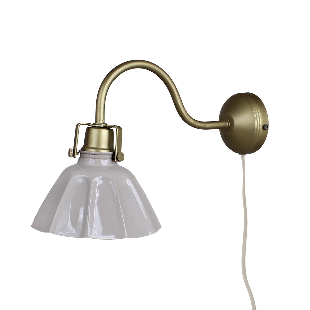 Wall lamp made of beige lacquered sheet metal. The lamp has a beige textile cord that measures 150 centimeters includes switch and plug. 40 Watt. Fits E14, light bulb not included.