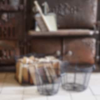 Wire basket in black with wooden handles.