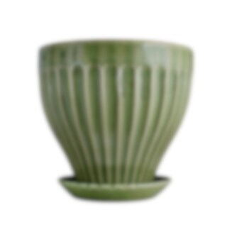 Stoneware pot with a beautiful relief pattern hand-glazed in a dark green color. Natural variations in the glaze gives life to the pots. The pot has a hole in the bottom which makes it possible to plant directly in the pot and a saucer that collects leftover water.