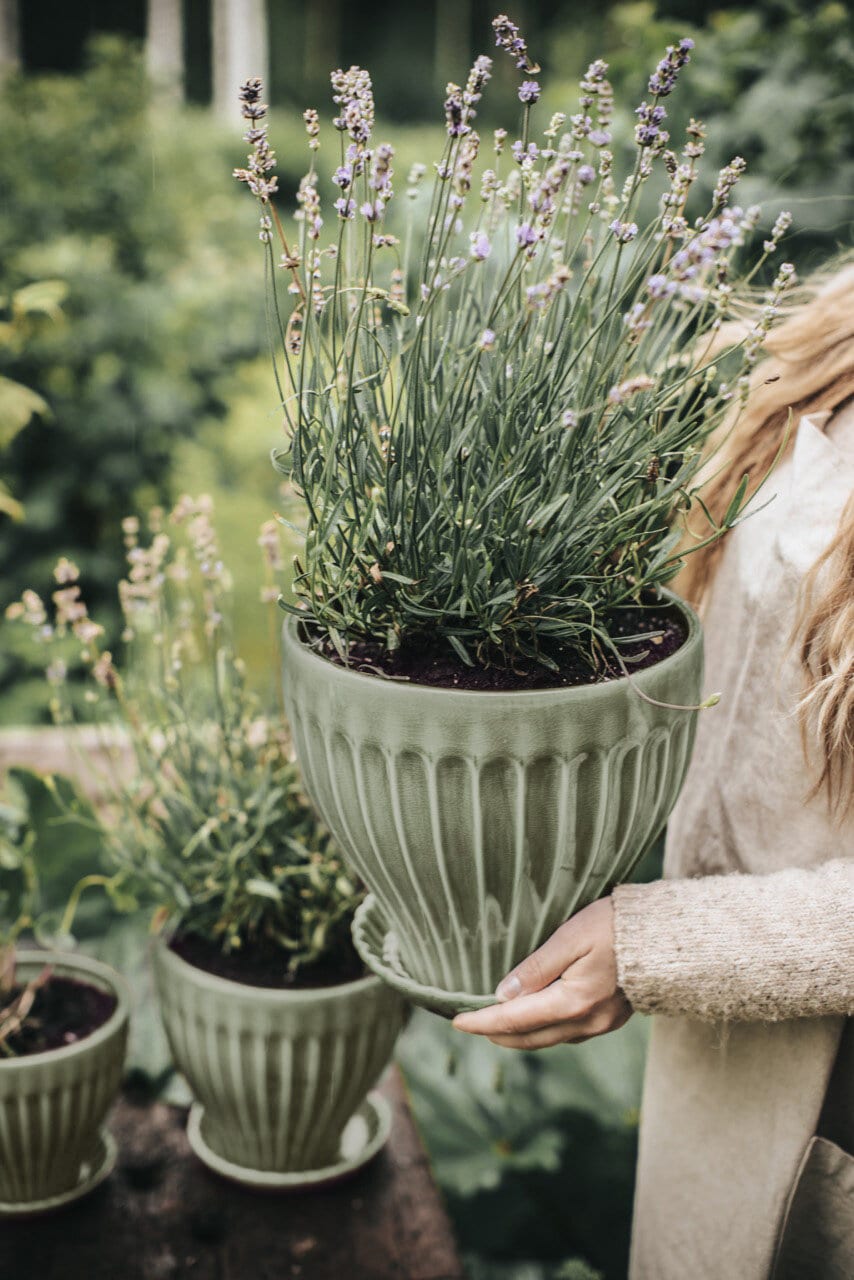 Stoneware pot with a beautiful relief pattern hand-glazed in a light green colour. Natural variations in the glaze gives life to the pots. The pot has a hole in the bottom which makes it possible to plant directly in the pot and a saucer that collects leftover water.