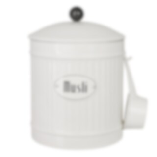 Round tin in white with a sign in white with the text Müsli. Comes with a scoop that can be hung on the side. From the tin series Hugo from Strömshaga.