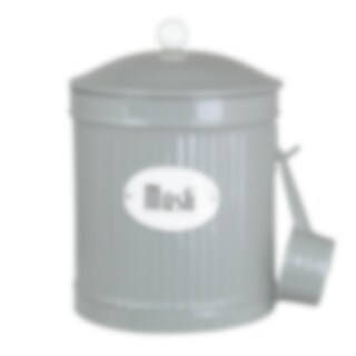 Round tin in green with a sign in white with the text Müsli. Comes with a scoop that can be hung on the side. From the tin series Hugo.