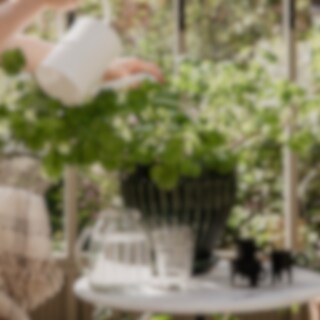 Glass pitcher with handle and a decorative etched pattern. The jug is made of 50-60% recycled glass. Not dishwasher safe.