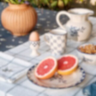 Egg cup in stoneware with an old-fashioned motif of a decorative check pattern in blue. Nice to combine and mix with the other motifs.