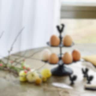 Decorative egg holder with a rooster, made of cast iron. Eggs can be stored at room temperature and then this egg holder will look nice on the kitchen counter.