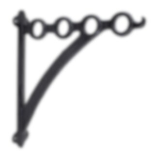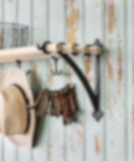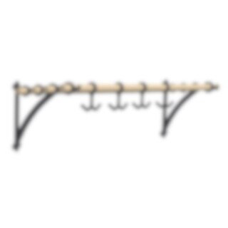 Black metal bracket mounted on a wall and joined by a wooden or metal round bar. The dimension of the holes for the round bar is Ø 28 mm with a ctc distance of 65 mm. The width of the shelves can be adjusted, depending on the length of the round rod. Add extra hanging space with anchor hooks on the round wooden rod.