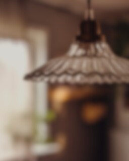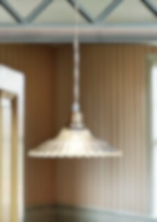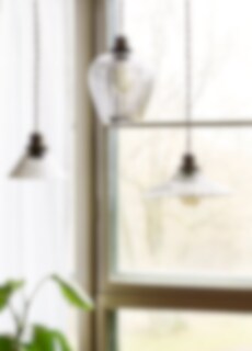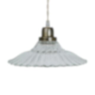 Decorative pendant lamp in glass with details in brushed brass. Beige twisted textile cord, length 150 cm. No switch on the cord or lamp plug, choose if you want to connect a plug for wall or ceiling. Fits E27, max 40W. Light bulb not included.