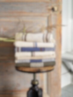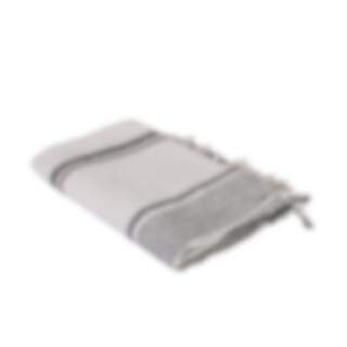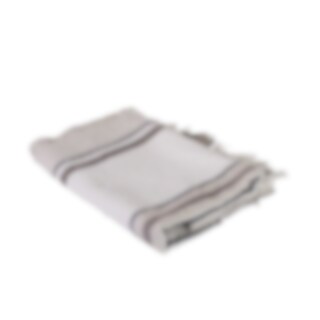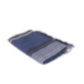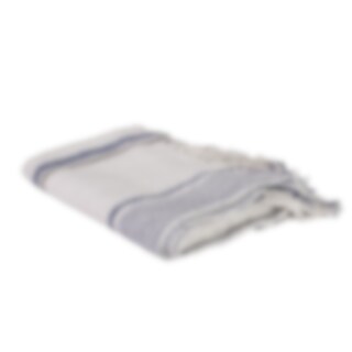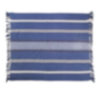 Plaid in soft cotton with a woven striped pattern in white, blue, and brown, with fringes. Perfect for the balcony, patio, or a picnic.