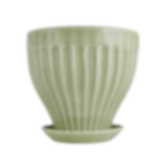 Stoneware pot with a beautiful relief pattern hand-glazed in a light green colour. Natural variations in the glaze gives life to the pots. The pot has a hole in the bottom which makes it possible to plant directly in the pot and a saucer that collects leftover water.