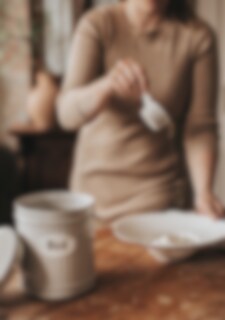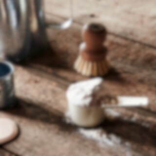 Measuring cup for 1 deciliter in beige sheet metal. Machine wash is not recommended.