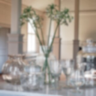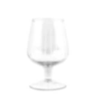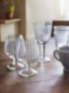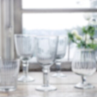 Glass on foot with etched stripes. Matches our other glasses and jugs in similar style! Dishwasher-safe. The glasses are made of 50-60% recycled glass.