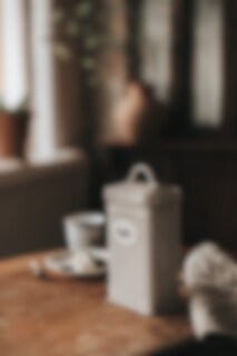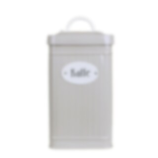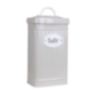 Stylish coffee tin in beige sheet metal with stripes. Tin with a lid and sign in white with the text Kaffe. From the tin series Hugo from Strömshaga.