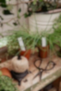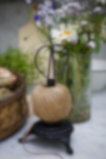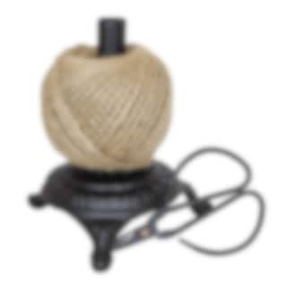 A decorative holder for twines and ribbons in cast iron. Including jute twine and a small scissors.