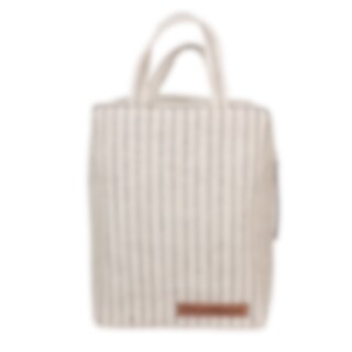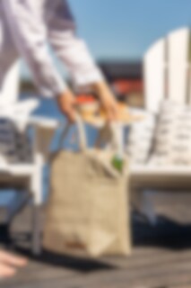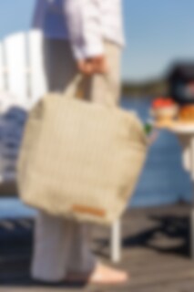 Practical cooler bag with handles and a zipper. The inside is insulated to keep your food and drinks cool; for further temperature reduction, use ice packs. The bag is made of jute fiber, a natural material and fast-growing plant that requires no fertilizers, pesticides, or large amounts of water. Jute is often used to create sustainable and environmentally friendly products. The material is biodegradable and durable, making it suitable for carrying weight and enduring wear and tear.