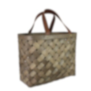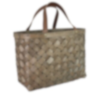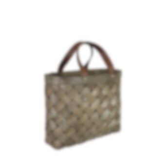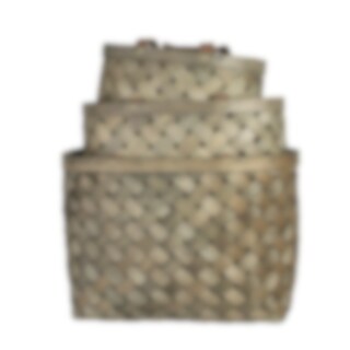 Rectangular wood baskets in grey with two leather handles. One set contains 3 different sizes.