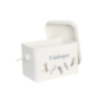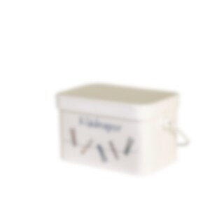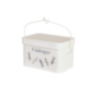 Small white tin with a charming motif of illustrated clothespins and the text "Klädnypor". The tin has a removable handle with hook for easy hanging.