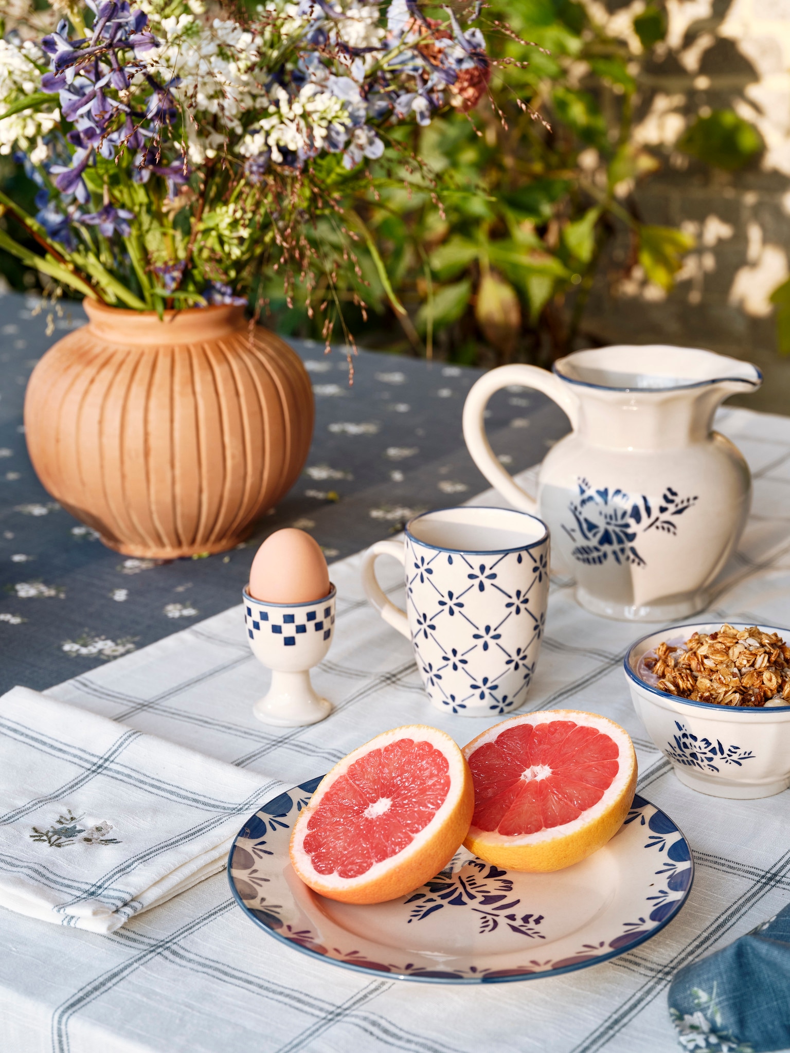 Mug with handle in stoneware with an old-fashioned motif of flowers and a decorative check pattern in blue. The pattern in the Marion series brings to mind the French countryside. Nice to combine and mix with the other motifs.