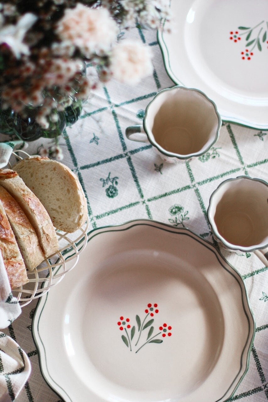 Elegant stoneware plate, decorated with a hand-painted floral pattern and a delicate green border. The Wildflower series design evokes a sense of nostalgia and works beautifully alongside other pieces in the collection.