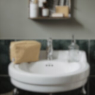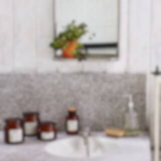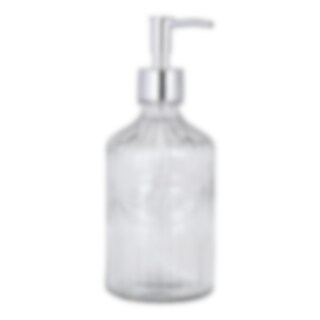 Soap dispenser in clear glass with striped pattern and the text SOAP. Pump lid made of plastic.