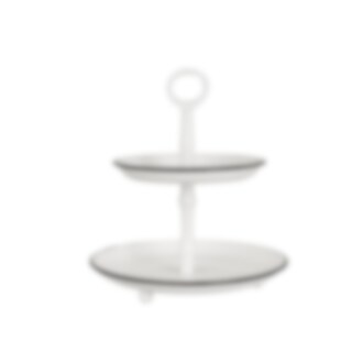 White two-tier cake stand with graphite gray edges. Ideal for serving cakes or presenting treats on a buffet. Features a top handle for easy carrying.
