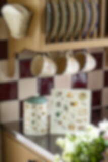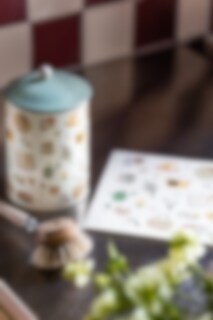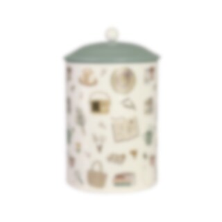 Tin with a cute garden theme design. Lid in green with a round white knob. The tin is handmade, which means that some differences and unevenness may occur. The tin is not dishwasher safe.