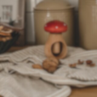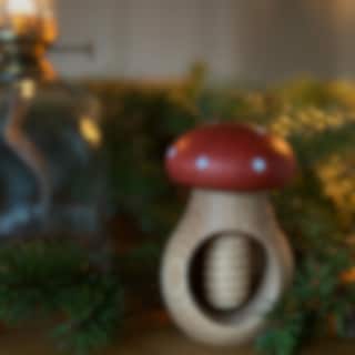 Nötknäckare i form av en flugsvamp tillverkad av bokträ. Svampens "hatt" är målad röd med vita prickar och används för att knäcka nöten genom att skruvas ner. Tillverkad av FSC-märkt trä.