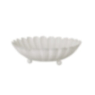 Vit skål i plåt med dekorativ kant som står på tre runda fötter. Skålen är handgjord i Indien och dess vågformade kanter är handklippta. Små variationer i färg och form kan förekomma.