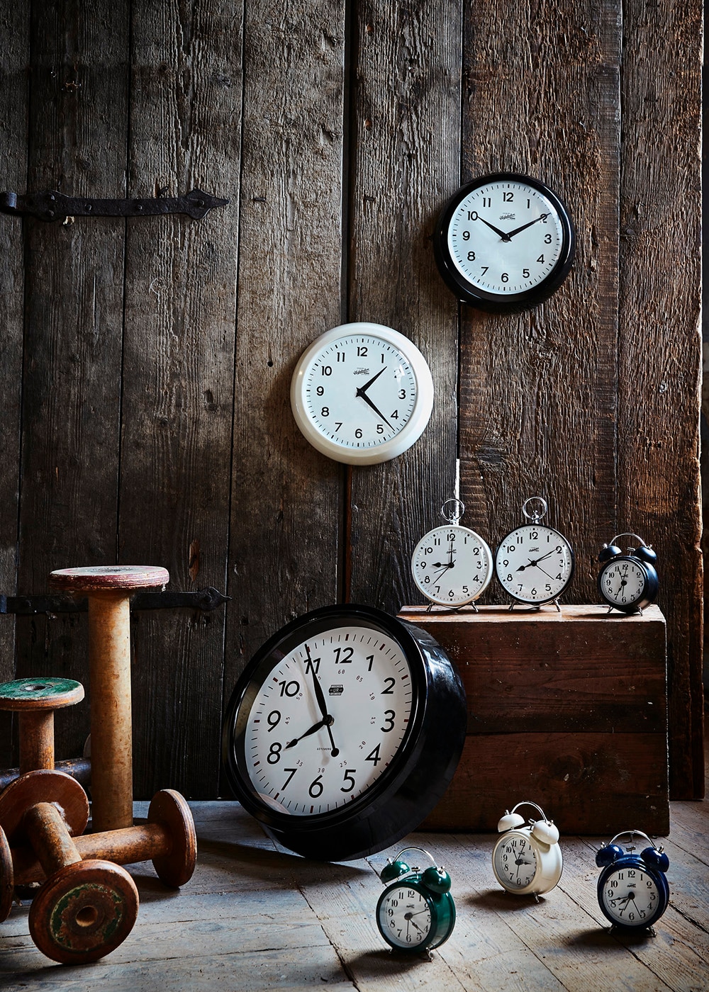 Väggklocka i klassisk och retro design med vit urtavla och svart kant. Klockan är märkt med texten Svenska Urfabriken, Göteborg. Passar utmärkt i köket, hallen eller vardagsrummet.