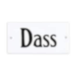 Plåtskylt i emaljfinish med texten "Dass". Två alternativ för upphängning; antingen med medföljande dubbelhäftande etikett eller med spik i skyltens två hål.