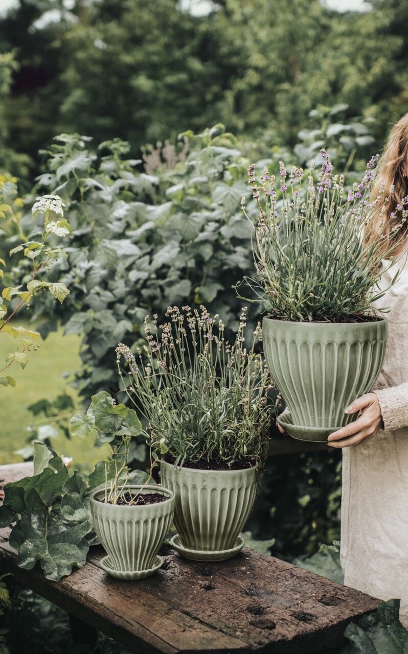 Kruka i stengods med fint reliefmönster handglaserad i en ljusgrön nyans. De naturliga skiftningarna i glasyren ger liv till krukorna som är fina att gruppera i olika storlekar och färger. Krukan har ett hål i botten vilket gör det möjligt att plantera direkt i krukan och ett fat som samlar upp överblivet vatten.
