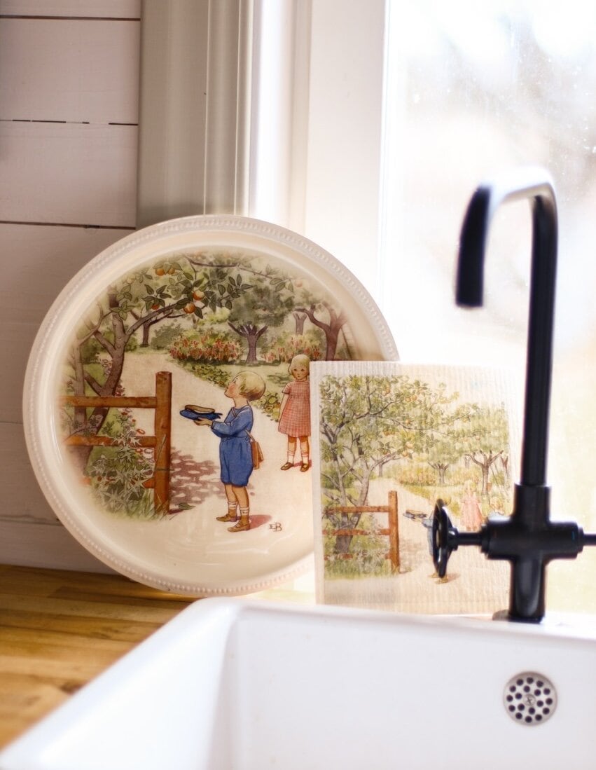 Rund bricka i off-white med ett charmigt motiv av en pojke i en äppelund. Konstverket är av Elsa Beskow, en av Sveriges mest älskade illustratörer och barnboksförfattare.