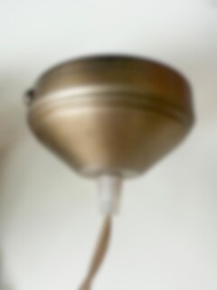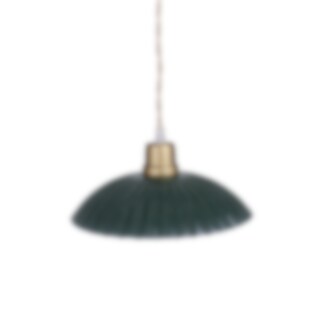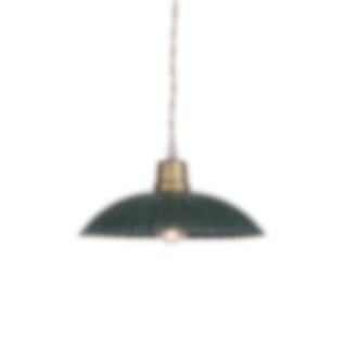 Mörkgrön taklampa i plåt med veckad skärm och naturfärgad tvinnad textilsladd. Sladdens längd ca 150 cm. Ingen strömbrytare på sladden eller kronkontakt, välj själv om du vill koppla på en kontakt mot vägg eller tak. Passar med lampa E27, max 25W. Glödlampa ingår ej.
