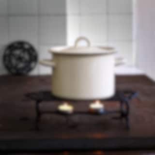 Rektangulärt grytunderlägg i smide på höga ben. Med plats för två värmeljus under för att hålla kärl och grytor varma. Både praktiskt och dekorativt!
