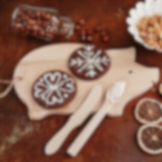 Skärbräda tillverkad av FSC-märkt bokträ med formen av en gris. Skärbrädan har ett hål och kommer med lädersnöre för enkel upphängning. Handdisk rekommenderas.