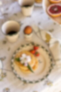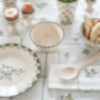 Assiett i stengods med handmålat gammaldags motiv av en blomma och dekorativ bård. Mönstret i serien Marion associerar tankarna till den franska landsbygden. Variationer kan förekomma i porslinet.