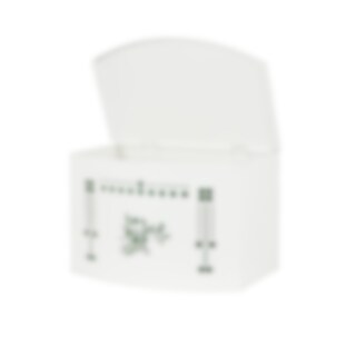 Vägglåda i plåt med gammaldags motiv av en blomma och dekorativ bård. Praktisk förvaring av torrvaror i köket, hål för upphängning. Plåtburken är handgjord vilket innebär att olikheter och ojämnheter kan förekomma.
