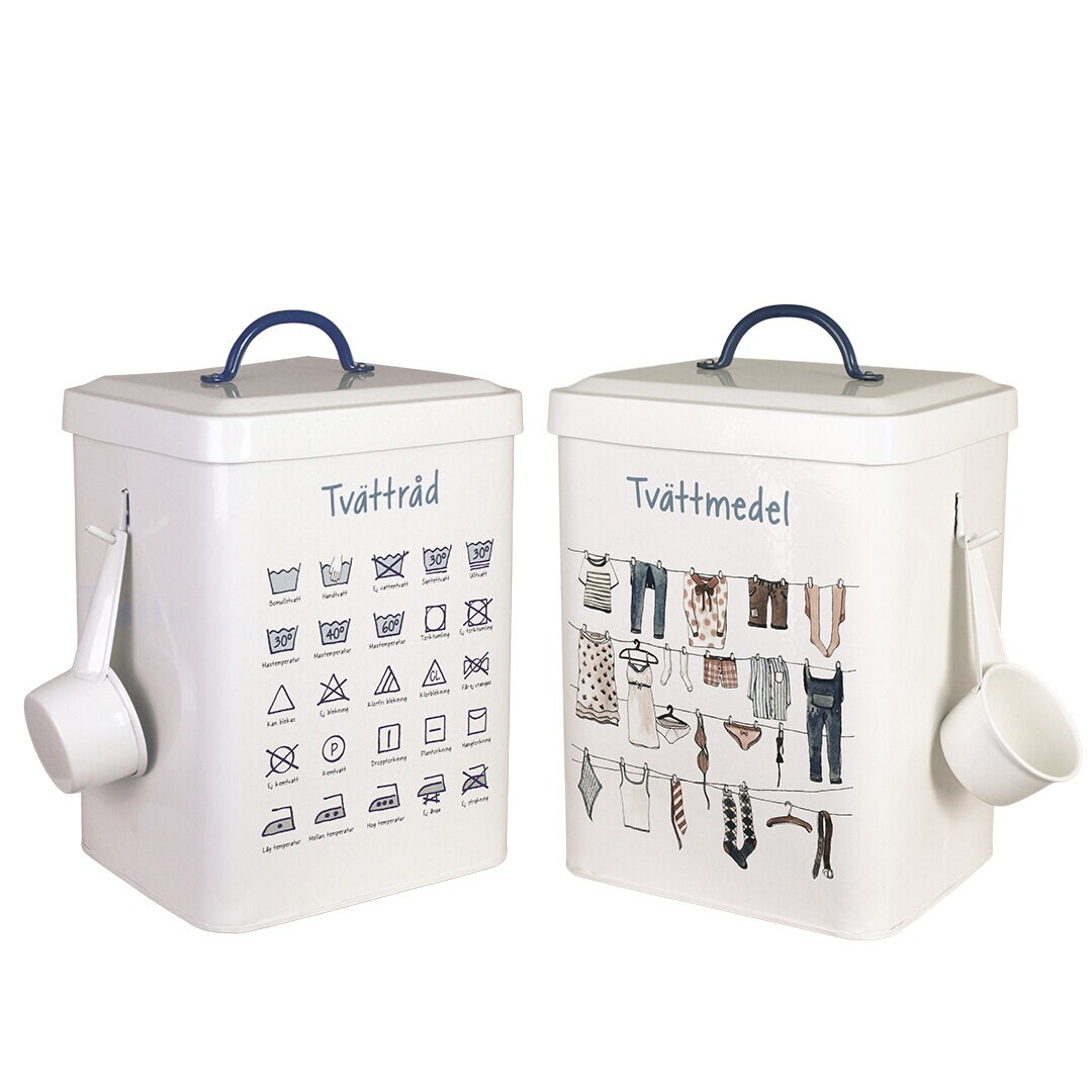 Vit plåtburk med charmiga motiv på båda sidor. På ena sidan visas ett motiv av tvättade kläder på linor tillsammans med texten "Tvättmedel", och på andra sidan visas tvättsymboler med texten "Tvättråd". En skopa som kan hängas på sidan medföljer. Två fack för olika typer av tvättmedel.