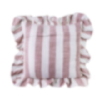Kuddfodral i 100% ekologisk bomull med bredrandigt mönster i en mjuk rosa nyans och en vacker volang. Dold dragkedja på baksidan. Jättefin att matcha med andra produkter i samma serie
