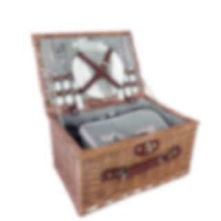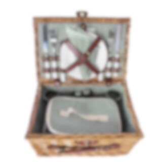 Picknickset i klassisk korgdesign med en charmig och tidlös känsla. Pilkorgen är omsorgsfullt flätad och klädd invändigt med ett vackert grönrandigt tyg som ger en mjuk och inbjudande touch. Perfekt för en mysig picknick i parken, på stranden eller i trädgården.