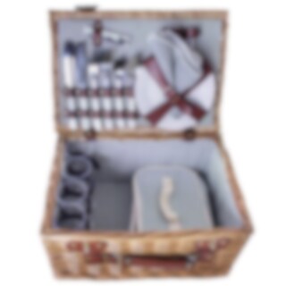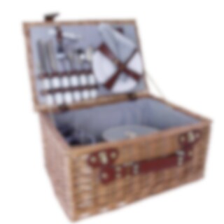 Picknickset i klassisk korgdesign med en charmig och tidlös känsla. Pilkorgen är omsorgsfullt flätad och klädd invändigt med ett vackert blårandigt tyg som ger en mjuk och inbjudande touch. Perfekt för en mysig picknick i parken, på stranden eller i trädgården.