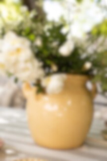 Keramikkrus i en mjuk gul färg med dubbla handtag. Perfekt för både praktisk förvaring, som kruka eller vas och dekorativt inslag i hemmet. Med sin stilrena design och subtila glans är detta krus en tidlös klassiker som passar in i både lantlig och modern inredning.  Perfekt för praktisk förvaring av exempelvis köksredskap - eller använd det som en charmig kruka för växter.