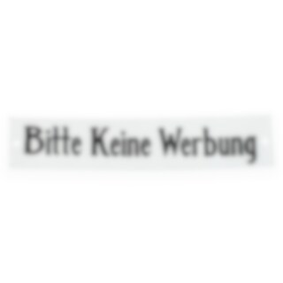 Plåtskylt i emaljfinish med text på tyska "Bitte Keine Werbung", för Ingen reklam tack. Två alternativ för upphängning; antingen med medföljande dubbelhäftande etikett eller med spik i skyltens två hål.
